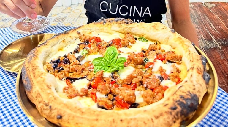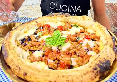 Pizza with sausage, fiordilatte and eggplant fried with tomato.