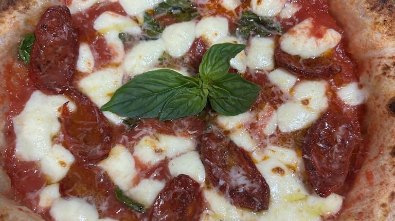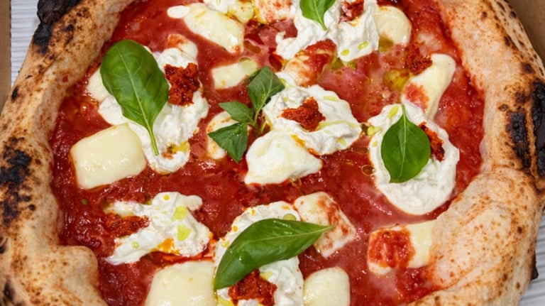 Pizza with fiordilatte, N’DUJA from Calabria Italian region and stracciatella from Puglia